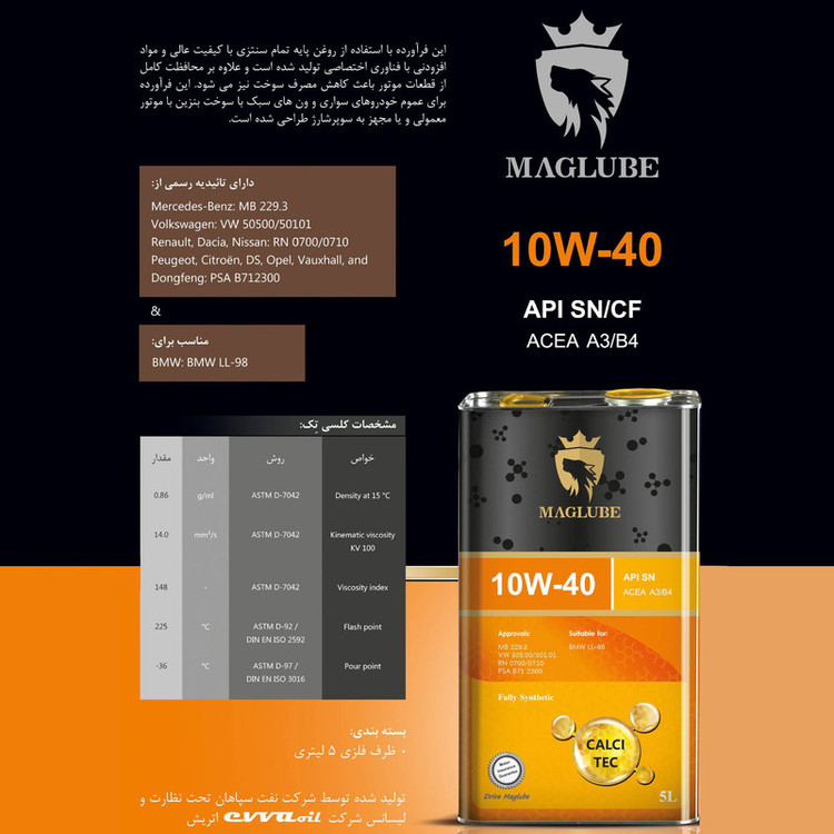 این محصول مناسب تمامی موتور های بنزینی و دیزلی میباشد و سازگار با استاندارد یورو 4 است. روغن مگ لوب در تمامی شرایط آب و هوایی چه در سرمای شدید زمستان و گرمای شدید تابستان به خوبی کار میکند.