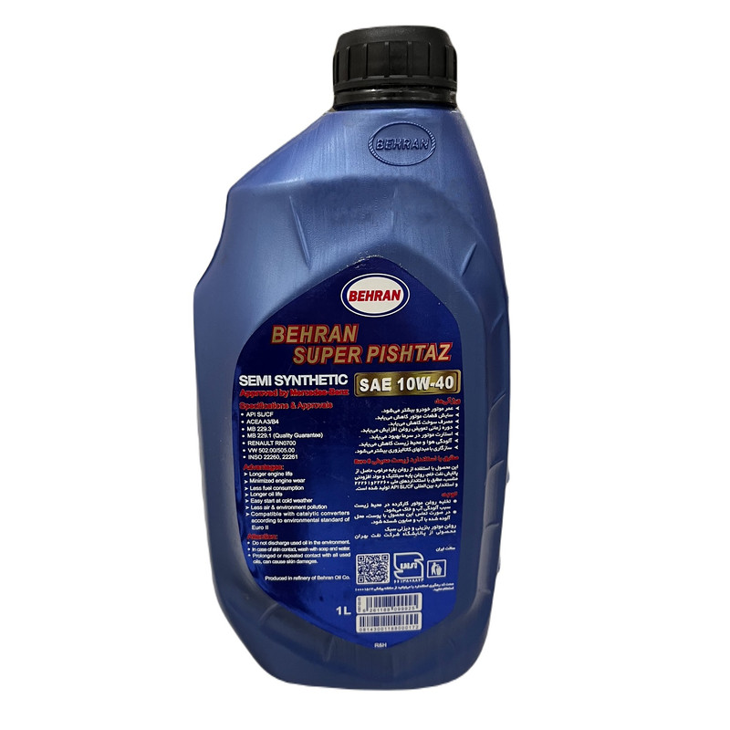 روغن موتور بنزینی بهران سوپر پیشتاز 10w40 نیمه سینتیک مرغوب با عملکرد عالی است که برای روانکاری خودرو های با طراحی موتور سال 2002 و بعد از آن پیشنهاد می شود. این محصول با استفاده از روغن پایه و مواد افزودنی مرغوب تولید می شود. بهران سوپر پیشتاز 10W-40 را شرکت Daimler AG (بنز) آلمان تایید کرده است. این روغن موتور بهران دارای گرانروی بالایی بوده که همین بالا بودن مانع اکسیداسیون و زنگ زدگی میشود و از ایجاد رسوب و تجمع آلودگی در میان قطعههای موتور جلوگیری میکند. روغن موتور بهران سوپرپیشتاز 10W40 SL/CF حجم 1 لیتر برای فصل سرد مناسب تر از فصل گرم میباشد.